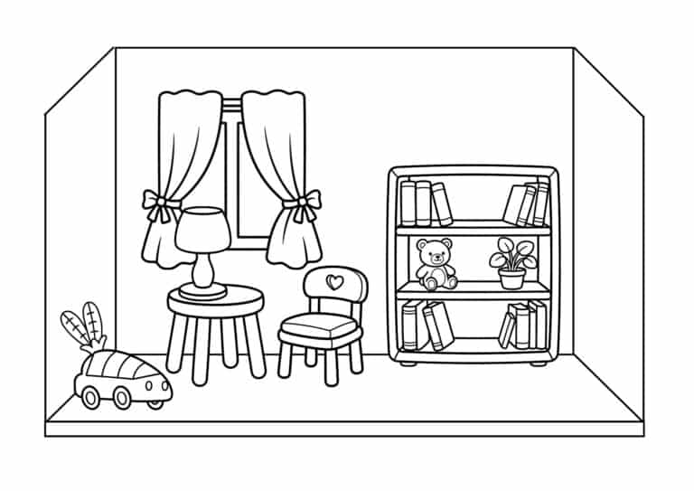 I kategorien finder I tegninger med både enkle former og mere detaljerede rum, så der er noget for børn i forskellige aldre. De mindre børn kan fokusere på store flader, mens de større børn kan fordybe sig i interiør, mønstre og små designelementer.